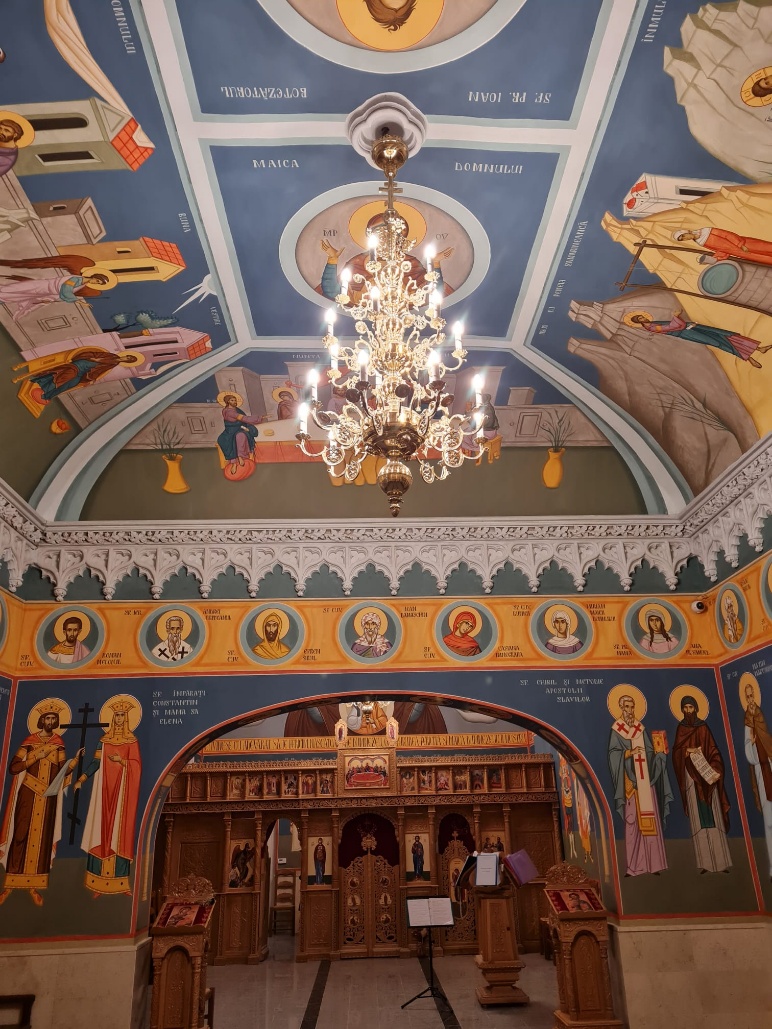 Les murs du sanctuaire, derrière l’iconostase, du naos et du pronaos ont été entièrement fresqués par l’iconographe Răzvan Prunean. Des vitraux-icônes, réalisés par le maître-verrier Răzvan Costea, ont été posés à la place des vitres