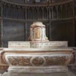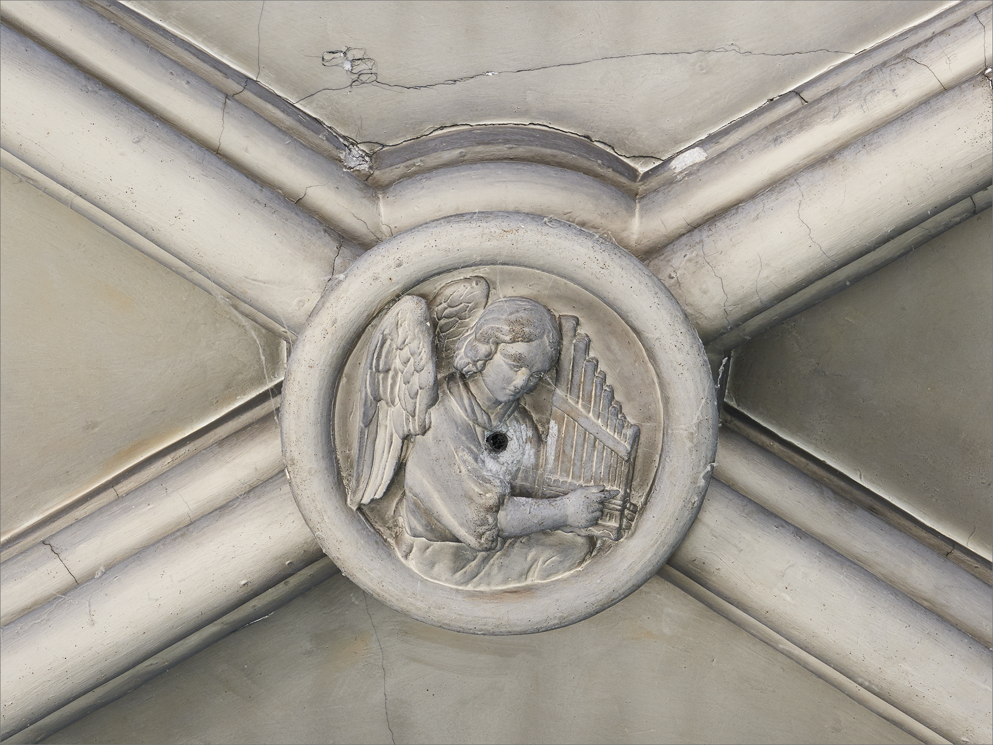 L’arc triomphal marquant l’entrée de l’abside est orné d’une suite d’anges agenouillés portant des phylactères.