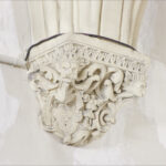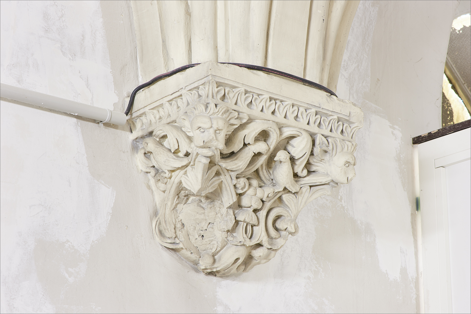 Les chapiteaux du vestibule [sous la tribune] sont ornés d’un décor particulièrement riche : on y trouve anges musiciens, lion, oiseaux, aigle, phœnix et oiselets dans un nid, feuillage et motifs géométriques divers dont des palmettes (sur impostes) ou des cordons tressés à perles (sur astragales).